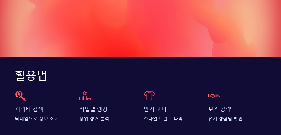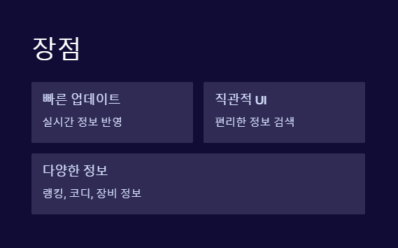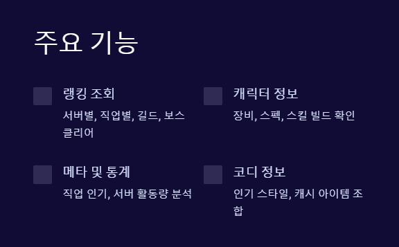 | 추가 기능 | 유저 리뷰, 보스 공략 정보 포함 | 단순 랭킹 조회 기능 위주 |