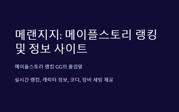 ‘메랜지지’는 **‘메이플스토리 랭킹 GG(Maple Ranking GG)’**의 줄임말로, 메이플스토리의 랭킹 및 캐릭터 정보를 제공하는 사이트입니다. 다양한 서버의 랭킹을 실시간으로 확인할 수 있으며, 캐릭터 정보, 코디, 장비 세팅 등을 조회할 수 있는 기능을 제공합니다.