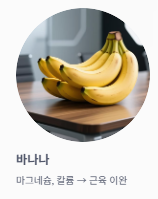 | 바나나 | 근육 이완에 도움을 주는 마그네슘과 칼륨이 풍부해 몸을 편안하게 만듭니다. |