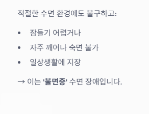 - 불면증은 단순한 잠 못 드는 상태가 아닌, 일상생활을 방해하는 수면 장애입니다.