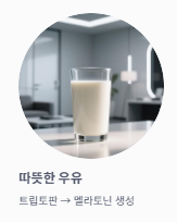| 따뜻한 우유 | 트립토판 성분이 수면 호르몬인 멜라토닌 생성을 도와 심신을 안정시킵니다. |