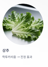 | 상추 | 줄기에 있는 락투카리움 성분이 진정 및 수면 유도 효과를 줍니다. |