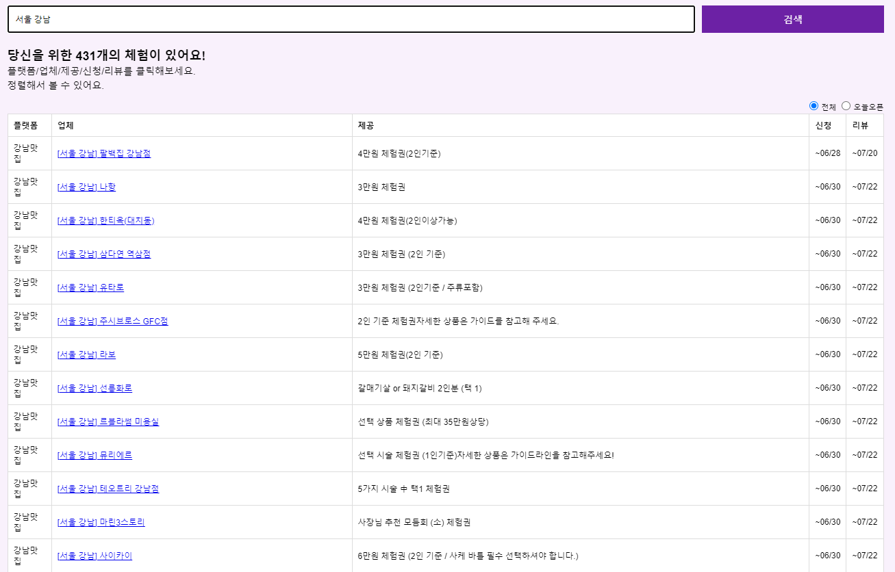 - 결과 확인: 검색 결과는 체험단 리스트로 표시되며, 불필요한 정보를 제외한 깔끔한 테이블 형태로 제공됩니다.