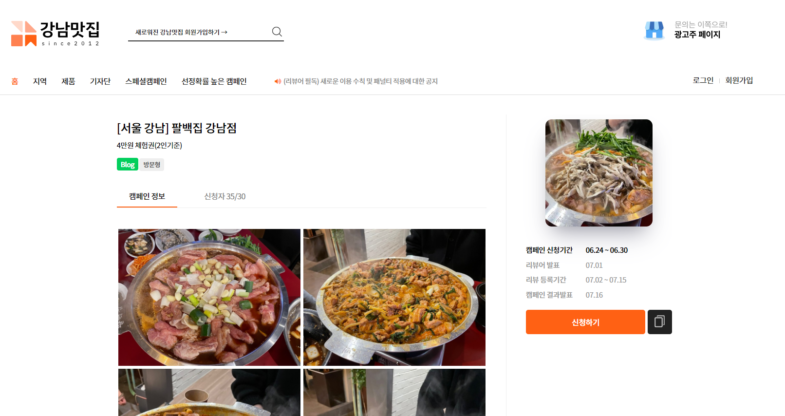 - 플랫폼 검색: '강남맛집', '디너의 여왕' 등 특정 플랫폼 이름을 검색하여 해당 플랫폼의 체험단 정보를 확인할 수 있습니다.