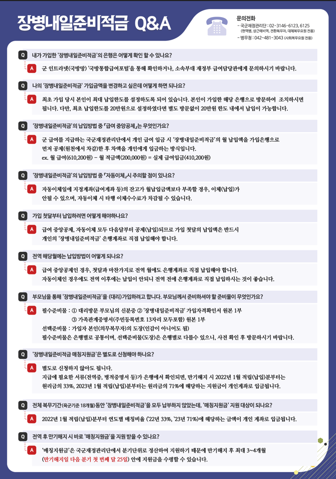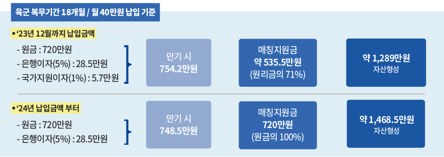 - 정부 지원: 전역 시 원리금 및 원금의 매칭비율에 해당하는 매칭지원금 지원