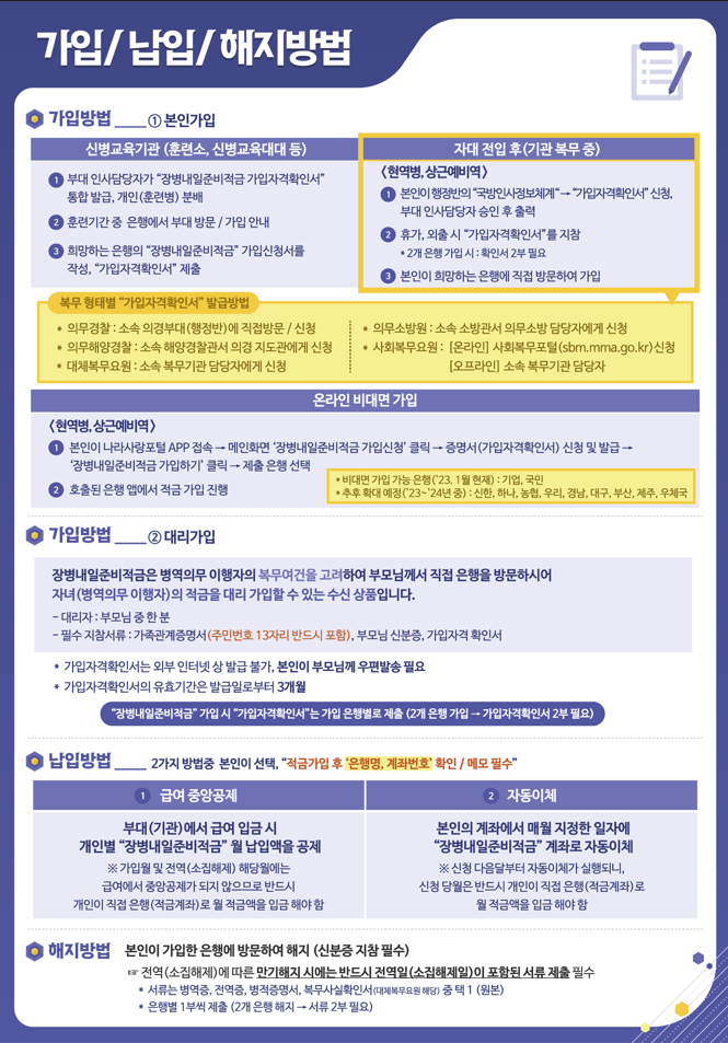 - 전역 전 급여에서 중앙 공제가 되지 않으므로 개인이 직접 은행 적금 계좌에 적금액을 납입해야 합니다.