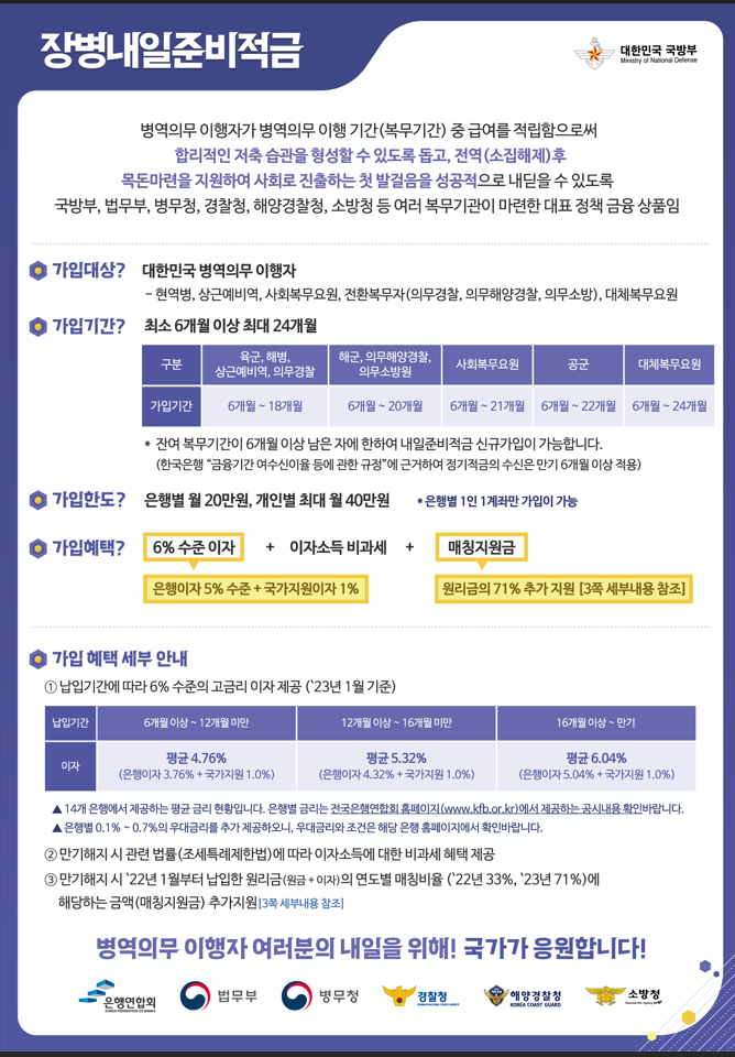 장병내일준비적금은 병무청, 국방부, 법무부, 시중 은행들이 업무협약을 맺어 출시한 고금리 자유적립식 정기 적금 상품입니다. 자유적립식이기 때문에 큰 부담 없이 가입할 수 있습니다.