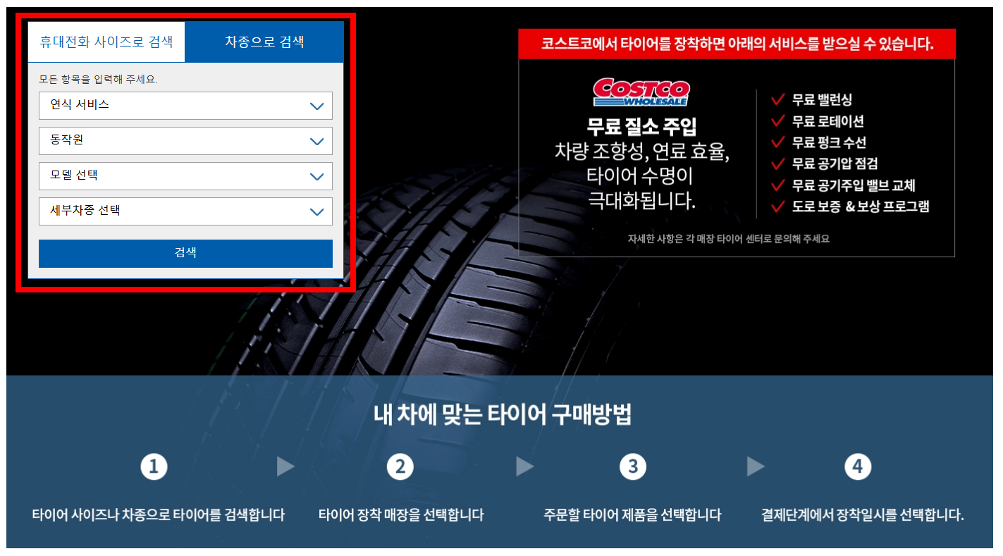 - 코스트코 온라인몰에서 차종 및 타이어 사이즈를 입력하면 호환되는 타이어 목록이 나타납니다.